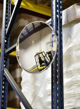 في المستودعات أو المصانع، يمكن لمرآة السلامة المرورية أن تساعد سائقي الرافعات الشوكية على الرؤية في الممرات والمعدات.