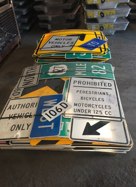 Includes blue-and-red shield-shaped signs and green, blue, yellow, and orange markers to alert drivers to interstate highway entrances.